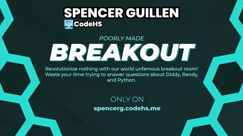 Created by me and a couple of friends, this escape room is heavily unoptimized and overall quite shitty. It was supposed to be about Diddy and Randy but we got side-tracked at made most of the questions programming related. It was made in the span of an hour and 30 minutes, and it shows.