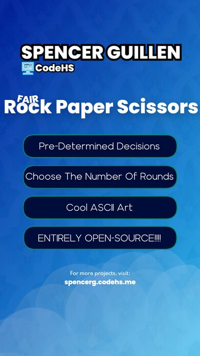 Fair Rock Paper Scissors. I haven't seen a single RPS game that's been advertised as fair, where the computer's choice is generated before the user's, so I took it upon myself to make it. With shitty code, optimized from the depths of hell, held together with spit and pink hubba bubba bubblegum, I present to you, FAIR ROCK PAPER SCISSORS!!!!!!